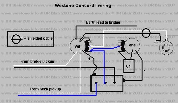 This wiring diagram is taken from a 1984 Concord I. The pots are 250K log/audio, the tone capacitor is 0.047 microfarad Mylar. Pickup resistance - neck 4.74K, bridge 4.73K