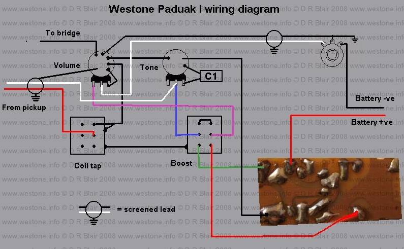 This wiring diagram is taken from a 1981 Paduak I The pots are 500K log/audio, the tone capacitor is 22nF Mylar.Both switches are DPDT. An SPDT switch can be used for the coil tap, it does not need a DPDT switch..The battery negative (Black) wire connects to the switched terminal on the jack socket.Pickup impedance is 11.62K (Humbucker), 5.74K when coil tapped.